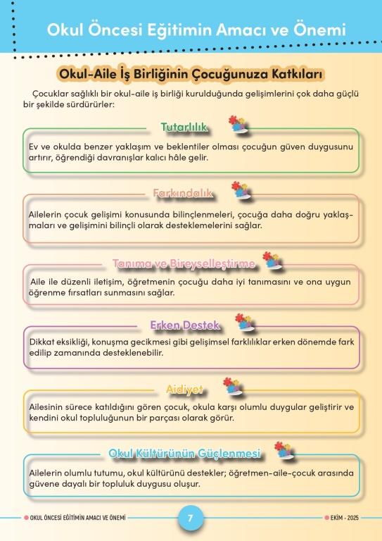 Bu amaçlarla yayımlanan ekim ayı Aile Eğitim Bülteni, "Okul Öncesi Eğitimin Amacı ve Önemi" temasıyla hazırlandı. Bültenin içeriğinde "Okul Öncesi Dönemin Özellikleri, Okul Öncesi Eğitimin Önemi, Okul Öncesi Eğitimin Amacı, Çocuğunuzun Bir Günü Okulda Nasıl Geçer, Okul-Aile İş Birliği Nasıl Sağlanabilir, Okul-Aile İş Birliğinin Çocuğunuza Katkıları" başlıkları yer alıyor.